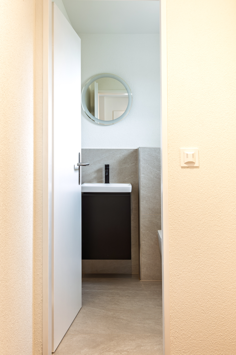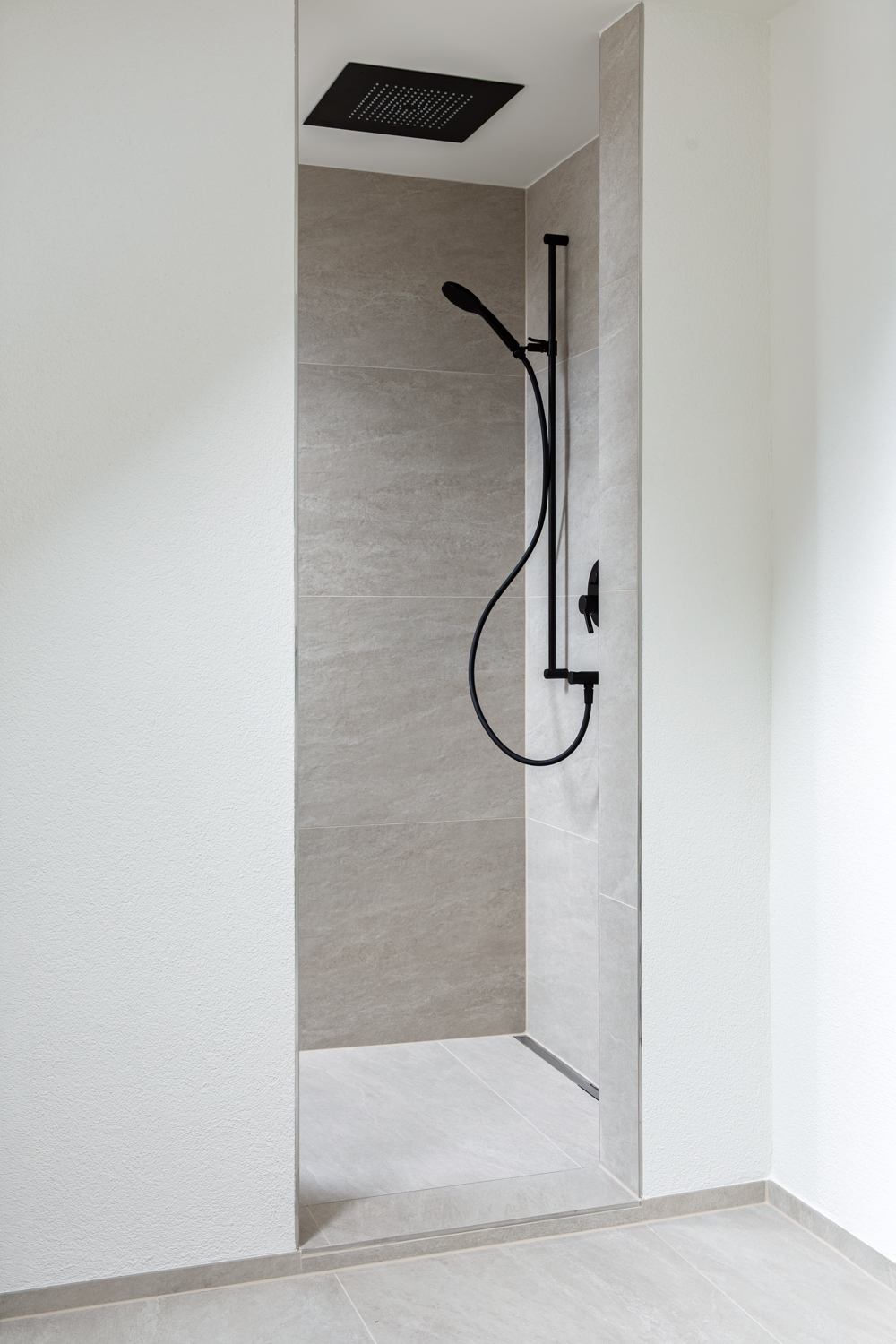 Die Planung besticht durch eine optimale Nutzung der kleinen Fläche. Es bietet sowohl ein WC als auch eine grosszügige Dusche, die geschickt integriert sind, um den Raum funktional und gleichzeitig ansprechend zu gestalten.
